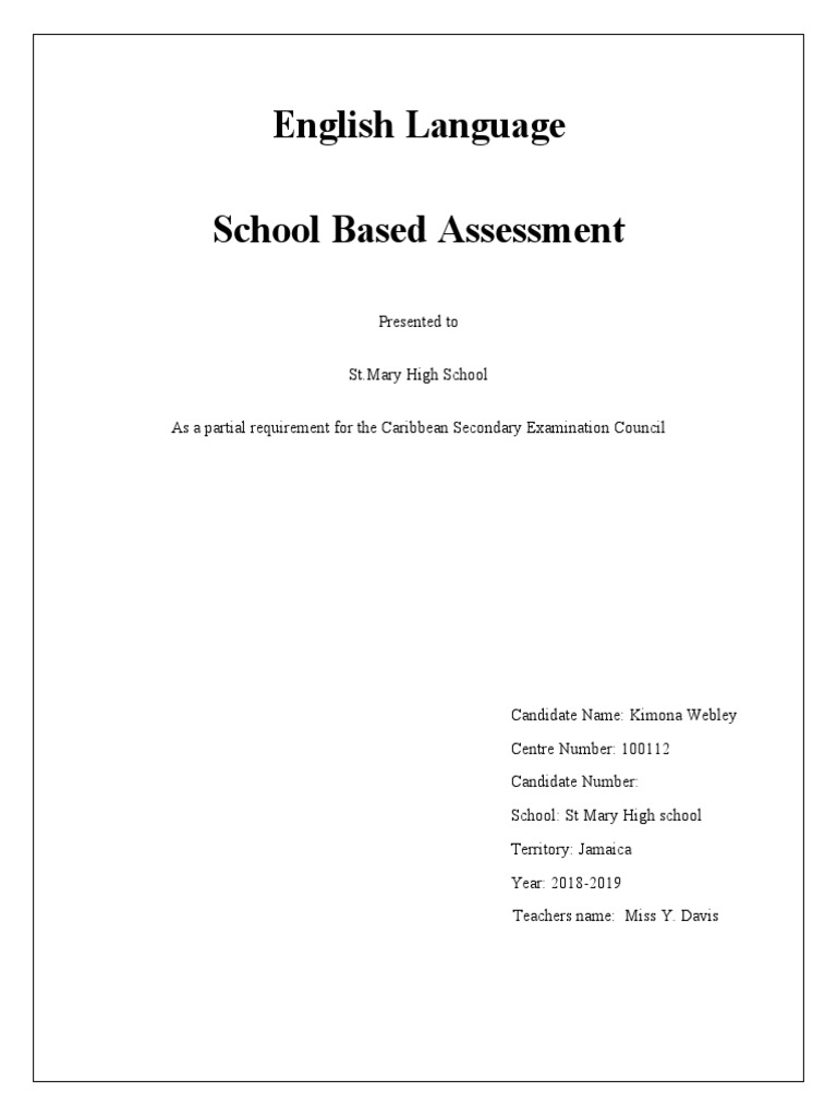 Think about how they have inspired you impacted you as well as. You should have three reflections in all and each reflection has a different focus. PLAN OF INVESTIGATION The subtopic of noise pollution is an issue that not everyone knows of which is why I have chosen this topic to research on. As a student of the English Language this SBA will enhance my oral communication skills and writing skills. Reflection 1 In this reflection you are expected to reflect on how each of the three pieces you have selected shaped your thinking about the topic. CSEC ENGLISH SCHOOL BASED ASSESSMENT HEALTHY LIFESTYLES IN JAMAICA Rollando Williams 100111 February 8 2019 St. THE ENGLISH A SBA.